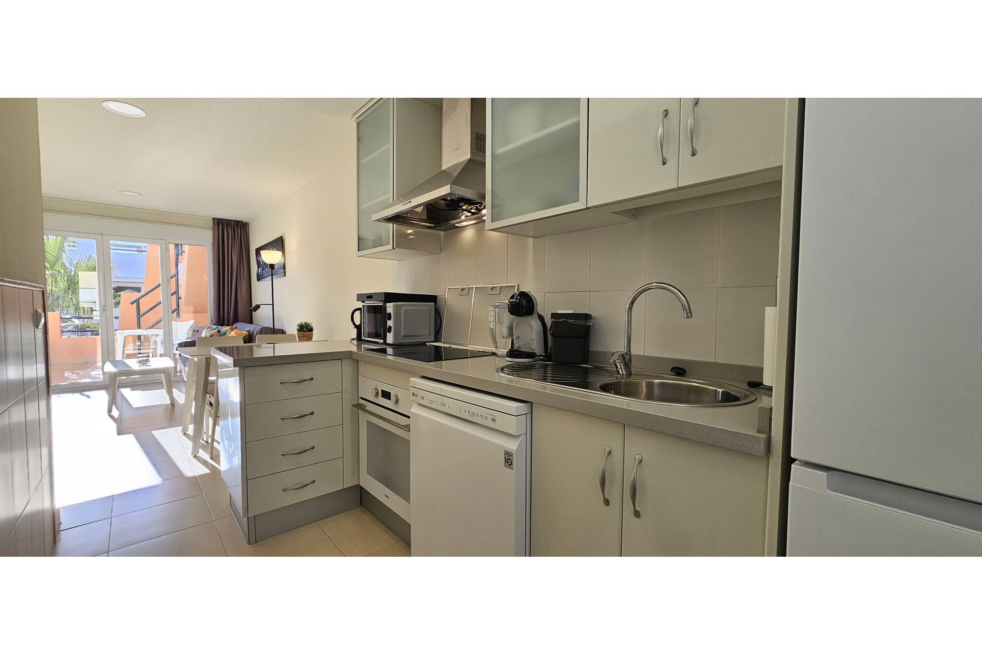 Apartamento recién reformado. El apartamento consiste en un salón/comedor, cocina con refrigerador y congelador, microondas, horno, vitrocerámica, campana extractora y lavavajillas, cafetera (Nescafé Dolce Gusto ). Salón con TV plana.