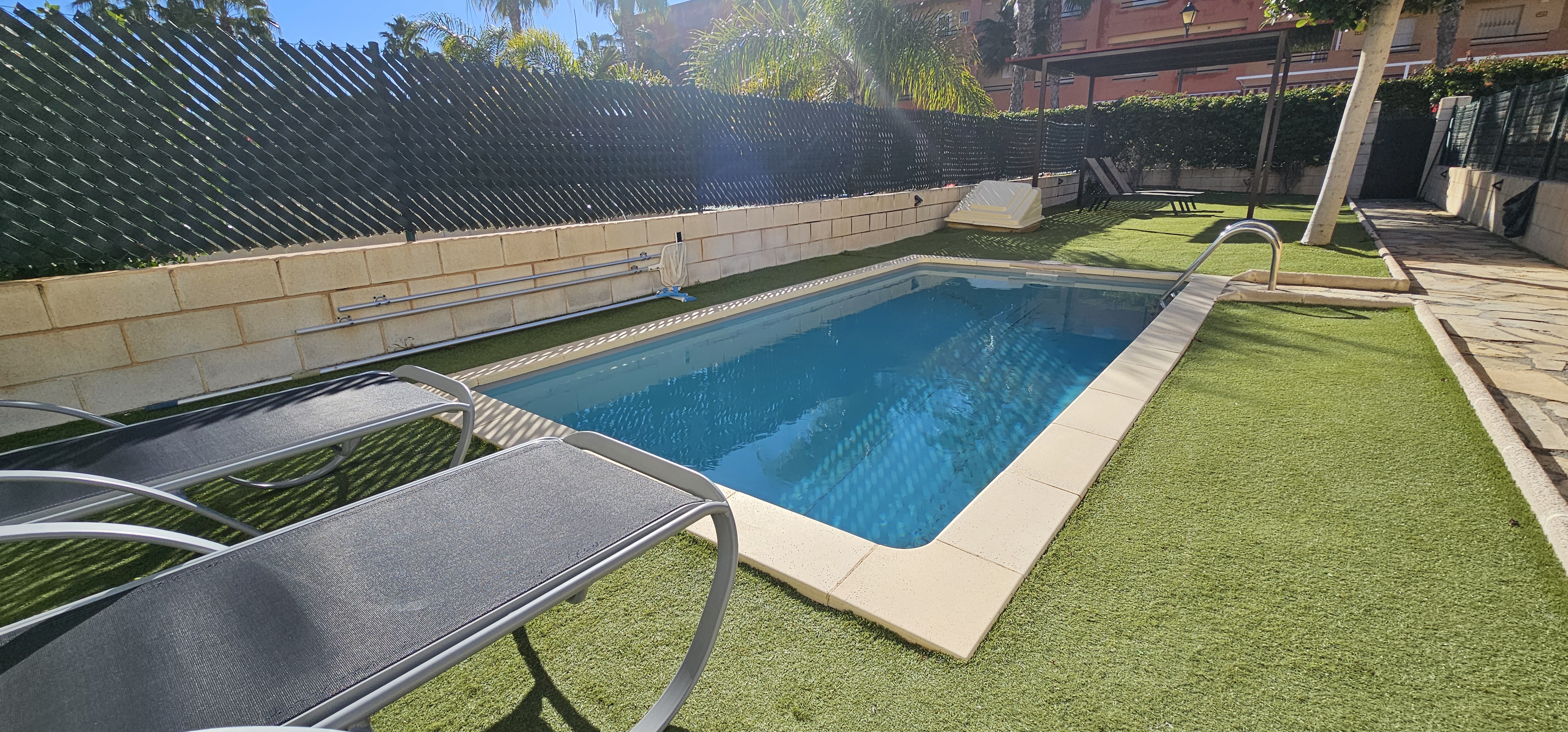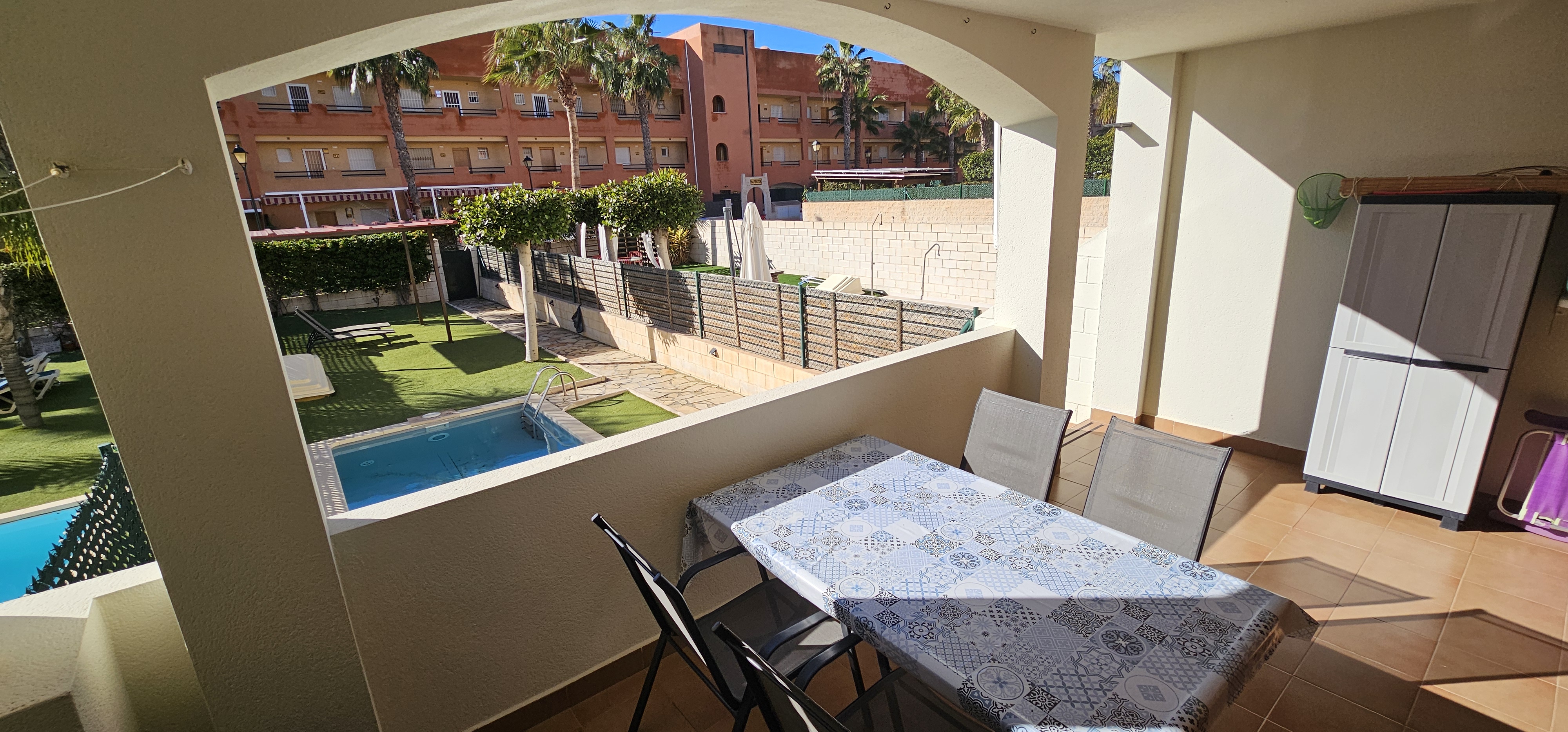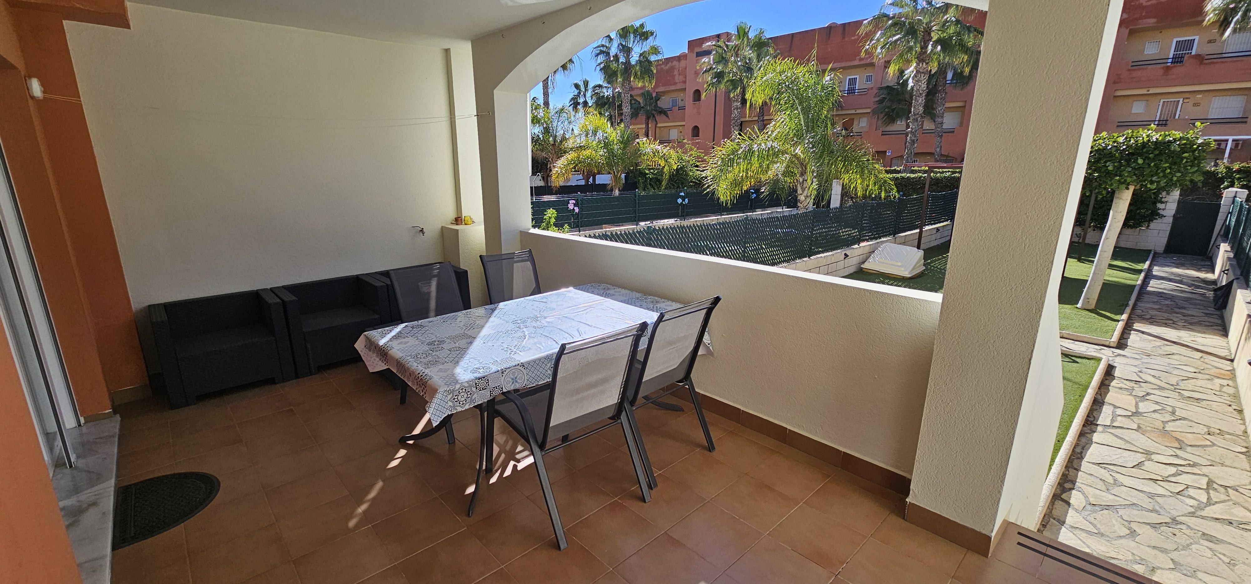 Het appartement heeft 2 terrassen, één aan de voorkant en één in de tuin bij het zwembad. Het terras is voorzien van een tafel en stoelen en een lounge set. De tuin is ruim 100 meter en heeft een privé zwembad, kunstgras, en er zijn zonnebedden. Er is een directe toegangsdeur tot de tuin.